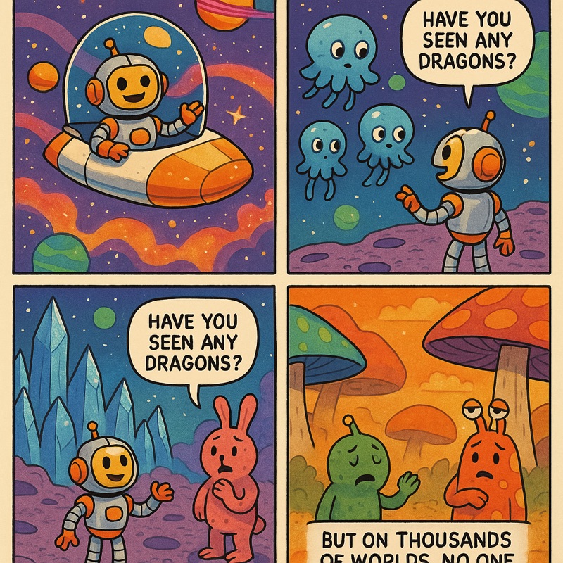 Pewien dzielny robot przemierzał galaktykę w poszukiwaniu smoków. Odwiedzał przedziwne krainy, w których wypytywał mieszkańców o smoki. Pomimo tego, że widział tysiące światów i spotkał przeróżne istoty, nikt nigdzie smoka nie widział.