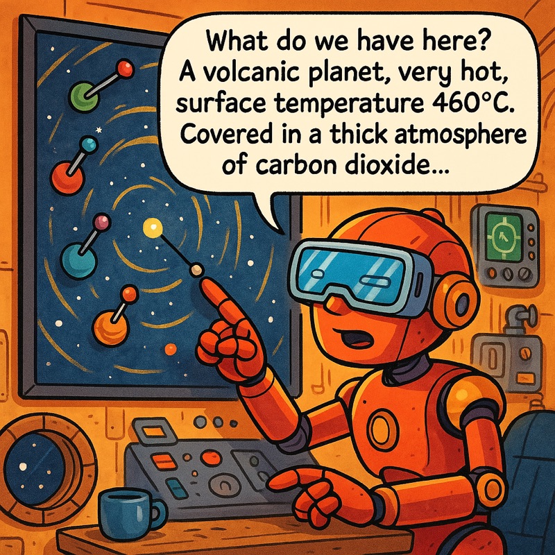 - Co my tu mamy – palcem stukał w niewielki punkcik – Planeta wulkaniczna, bardzo ciepła, temperatura powierzchni wynosi 460°C. Tak, jej powierzchnia jest pokryta gęstą atmosferą, która składa się głównie z dwutlenku węgla. Może jednak żyją tam smoki?