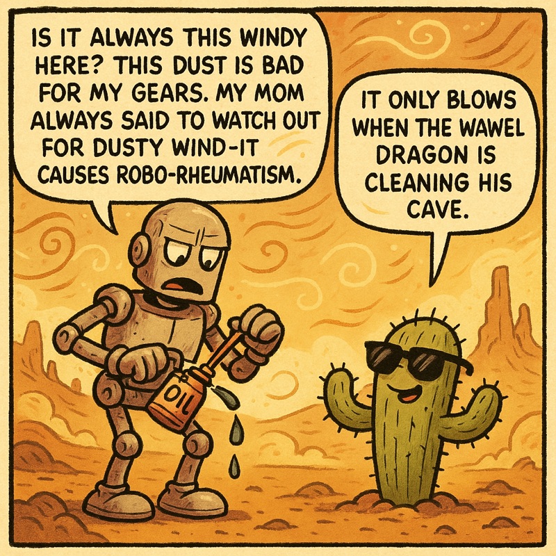 - A czy zawsze tutaj tak wieje? Ten pył jest niezdrowy dla moich trybików – robot wciągnął olejarkę z kieszeni i zaczął się smarować.– Mama zawsze mówiła abym uważał na wiatr z pyłem, bo można dostać robo-reumatyzmu.