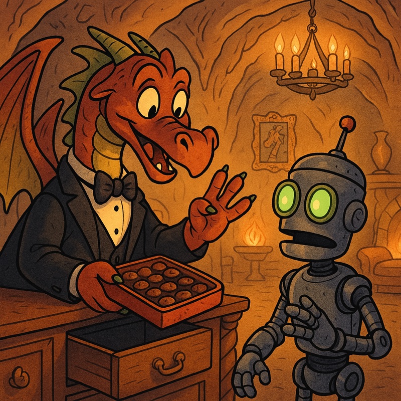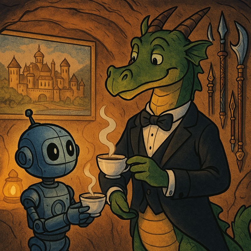 Pieczara smoka była urządzona wybornie. Na ścianach wisiały obrazy przedstawiające jakieś starożytne miasto oraz różne rodzaje broni, których robot nie znał. Smok, ubrany w bardzo elegancki smoking, podał robotowi filiżankę gorącej herbaty.