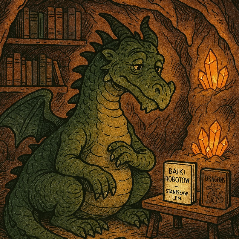 Smok Wawelski wyciągnął z kieszeni niewielki tomik Bajek Robotów Stanisława Lema i położył je na stoliku obok książki o smokach.